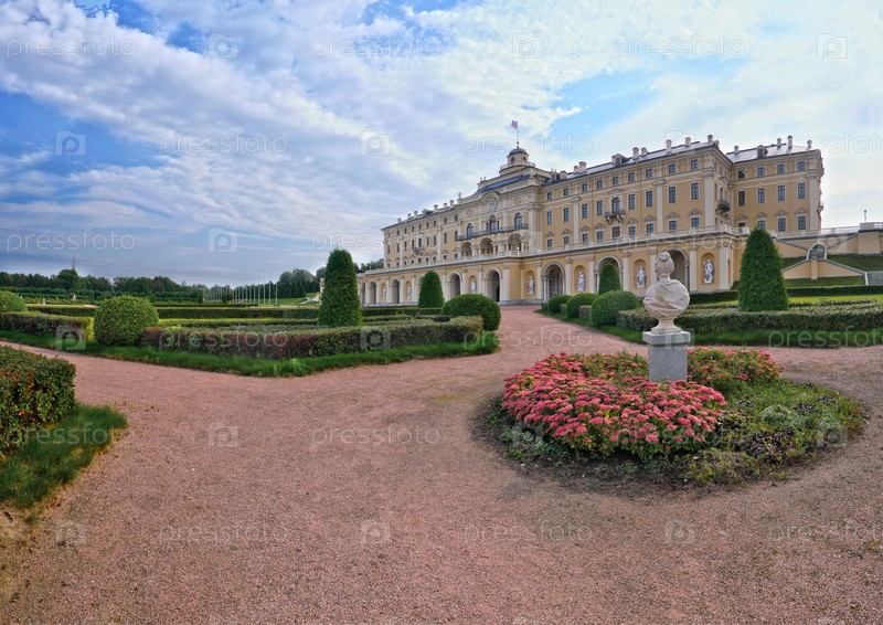 Константиновский дворец в Стрельне, вид из парка в летний солнечный день