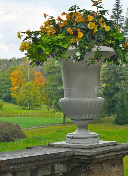 Цветение бегонии в архитектурном цветочном горшке на Большой лестнице Павловского парка (Санкт-Петербург) осенью