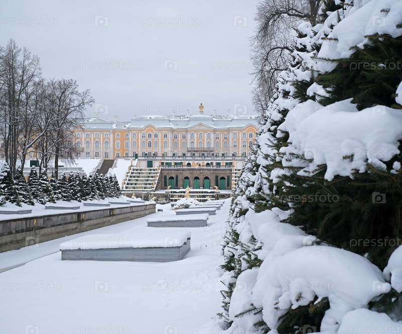 Канал Замороженного моря, ведущий к Большому дворцу в Петергофе, зимний пейзаж, Peterhof (Petrodvorets), Санкт-Петербург, Россия