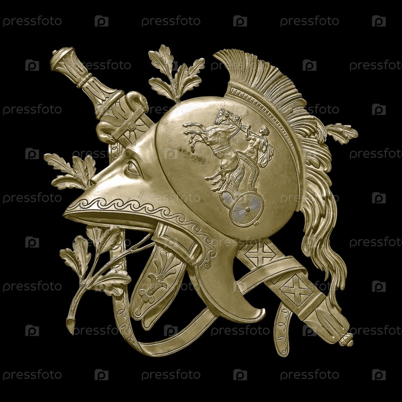 Золотой декоративный элемент интерьера с изображением шлема из древнегреческого мифа для создания плаката, афиши, баннера.Элемент изолирован на черном фоне