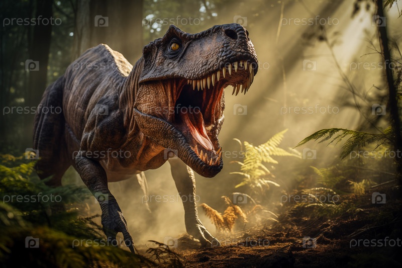 Тираннозавр Рекс рычит в доисторическом лесу с пышной растительностью, папоротниками и солнечным светом