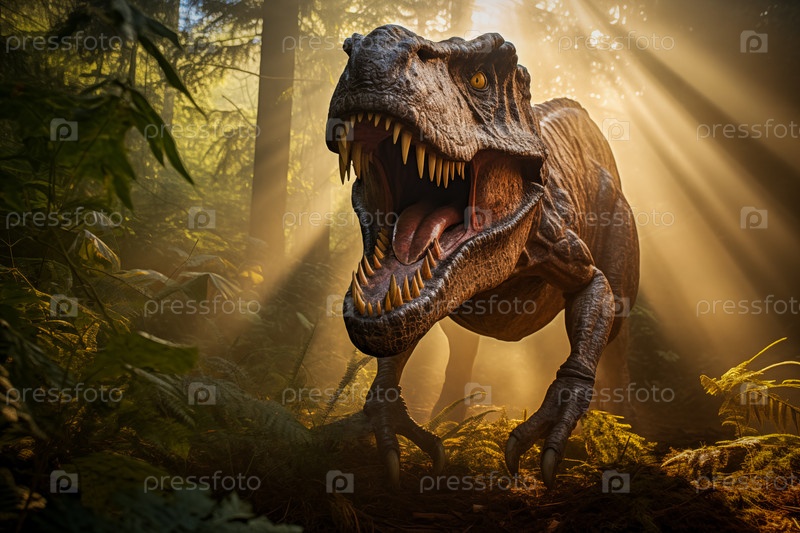 Тираннозавр Рекс рычит в доисторическом лесу с папоротниками и солнечным светом