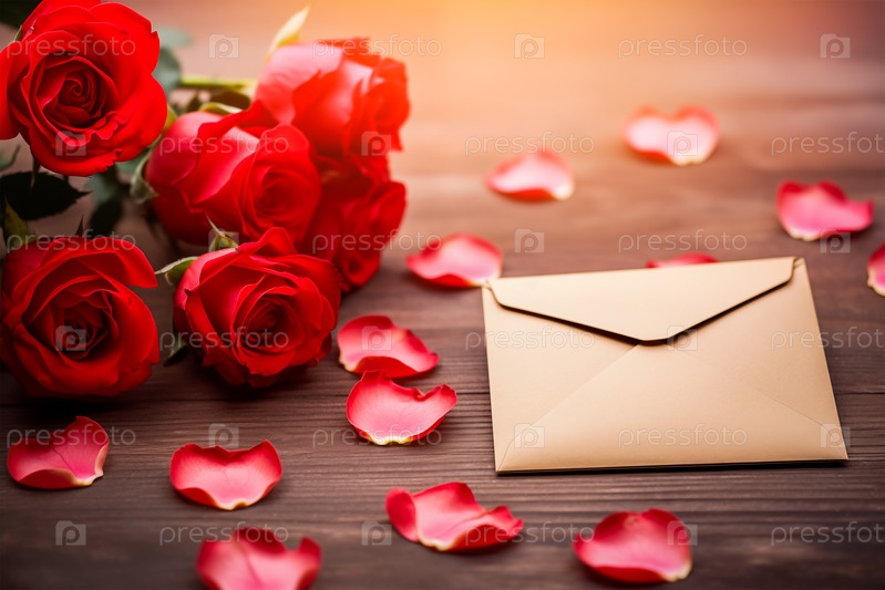 Ярко-красные розы, романтическое любовное письмо Валентина в элегантном конверте и рассеянные лепестки роз на темном деревянном столе
