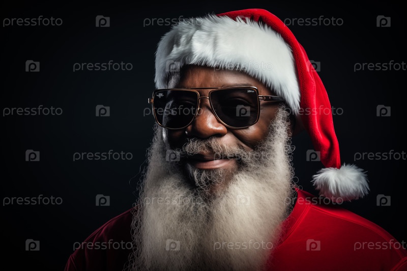 Современный черный Санта-Клаус в шляпе с солнцезащитными очками и длинной белой бородой, улыбающийся, глядя в камеру на темном фоне