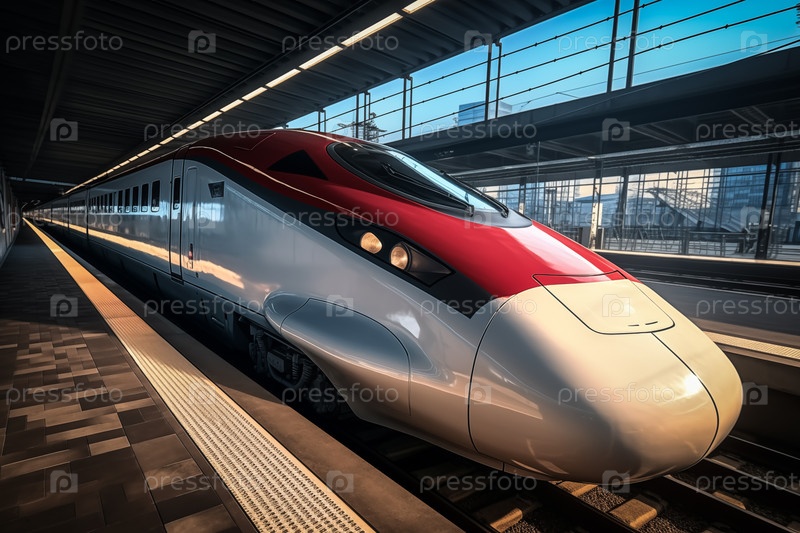 Современный высокоскоростной поезд на футуристической станции.Современные транспортные технологии, скорость, концепции путешествий.Железная дорога с эффектом размытия движения
