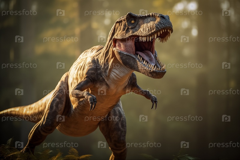 Тираннозавр Рекс рычит в доисторическом лесу с пышной растительностью, папоротниками и солнечным светом