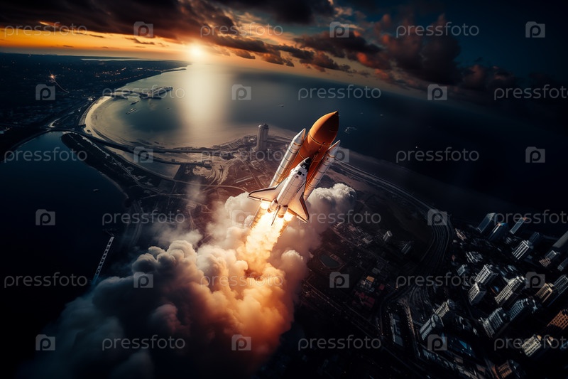 Вид с воздуха ракеты-носителя на рассвете над берегом океана.Ракета взлетает со следом дыма и пламени позади себя