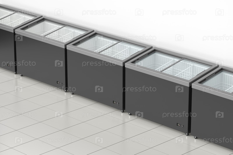 Роу с пустыми морозильниками в супермаркете