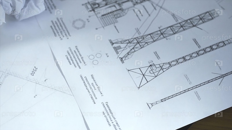 Верхний вид рабочего стола архитектора с чертежами и компьютером: ноутбук, очки, мобильный телефон, ручка, рисунок архитектора, закрытие