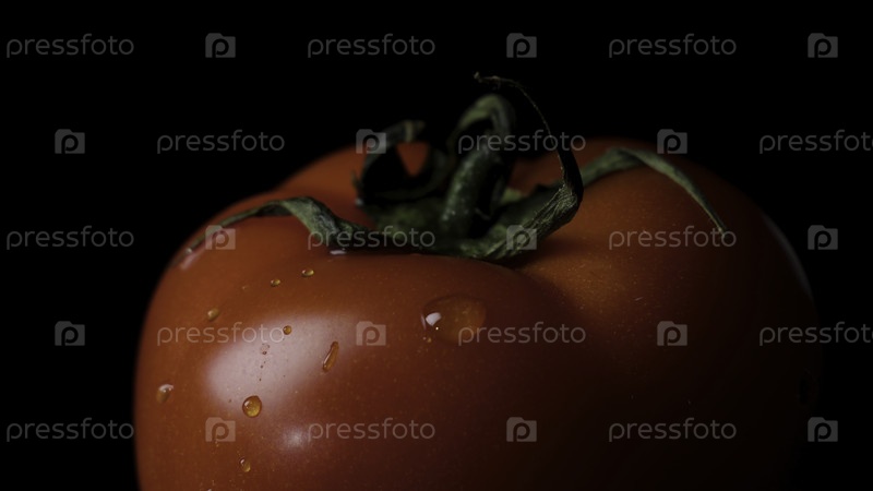 Красный спелый помидор покрывает капли воды, изолированные на черном фоне. рамка. томат изолирован против чёрного блестящего фона с реалистичным отражением и водяными каплями. свежие помидоры на черном фоне