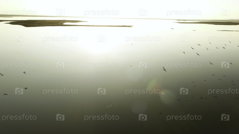 воздух для стаи уток на золотом закате над темно-синей рекой свет вечернего неба с стаями летающих диких птиц