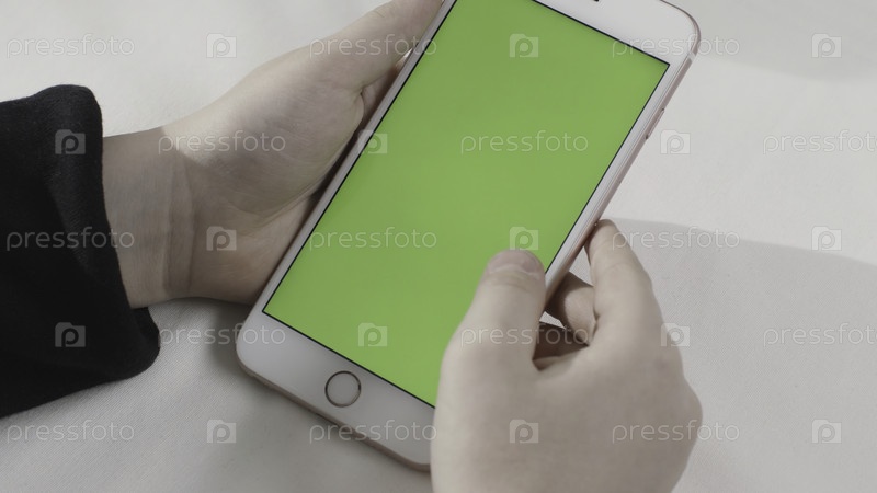 Рука, удерживающая зеленый смартфон с сенсорным экраном на белом фоне. резервные записи. рука, касающая мобильный телефон хромной клавишей