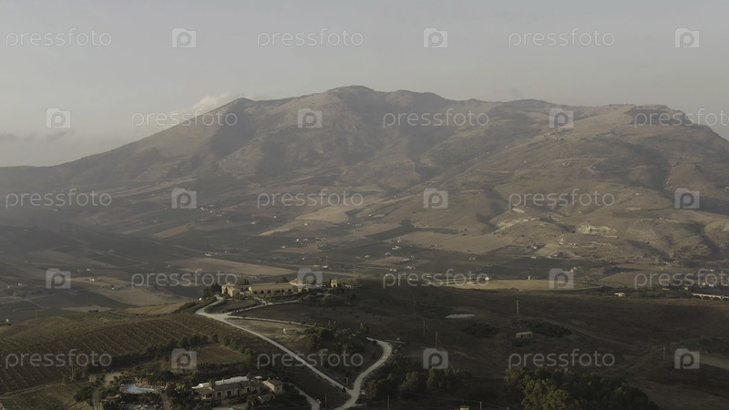 Впечатляющий пейзаж с большой горой, покрытой туманом и зеленой долиной у подножия