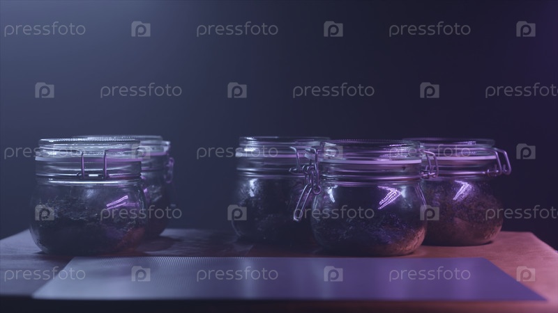 Пять стеклянных банок с различными видами листового чая стоят на столе в темной комнате у черной стены