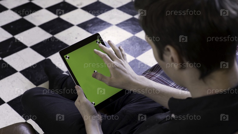 Бизнесмен использует цифровой планшетный компьютер с зеленым экраном на квадратном черно-белом фоне пола.Человек касается и прокручивает экран своего устройства хромакеем