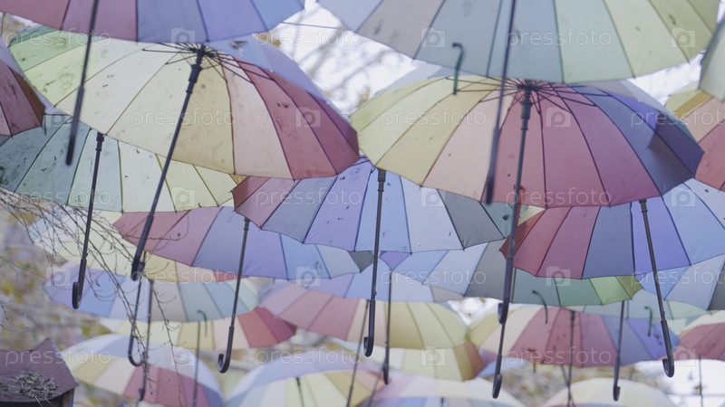 Аллея зонтиков. Идите вперед. Вид снизу с навеса многих красочных зонтов. Улица плавающих зонтов. Красивые цветные зонты покрывают всю улицу