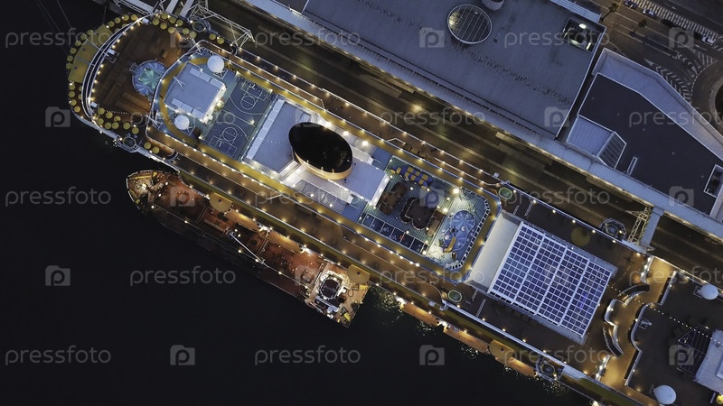 Большое круизное судно в порту, вид сверху.Круизный корабль 'Закат солнца' со всем необходимым для роскошного отдыха