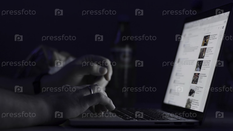 Руки мужчины работают на ноутбуке ночью. Ноутбук находится на столе. Вид сверху. Близкий снимок. Клюсовый кадр руки человека, печатающего на ноутбуке. Преступное понятие