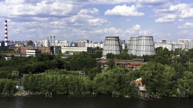 Полет над летним водохранилищем возле промышленной зоны города с дымоходами и множеством зеленых деревьев на фоне голубого облачного неба