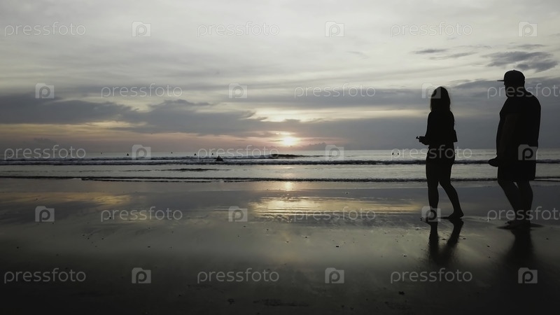 Золотой закат на океане и песке. видео. океанские волны на берегу при закате солнца. силуэты любящей пары при закате