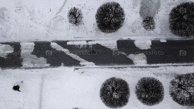 Вид с воздуха зимнего бегуна в туманный день через парк.Молодой человек, бегущий и бегающий в природном парке, потрясающие виды.Взгляд с воздуха Молодой человек бегает по зимнему лесу утром