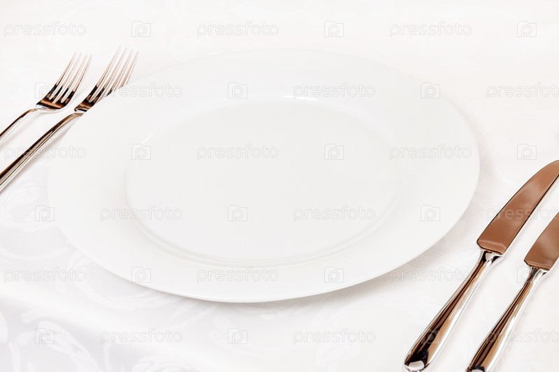 Белая пустая тарелка с вилкой и ножом