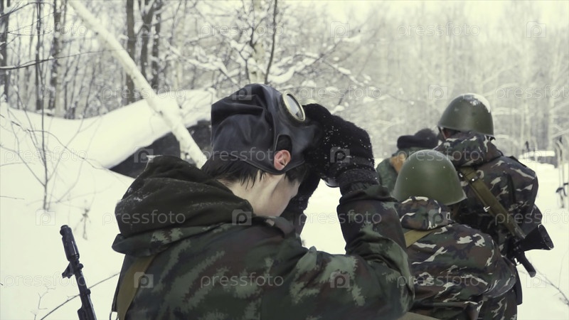 Солдат с пистолетом в холодном лесу.Зимняя война и военная концепция.Солдаты в зимнем лесу, катающиеся на лыжах с оружием.Военные учения в лесу медленным темпом