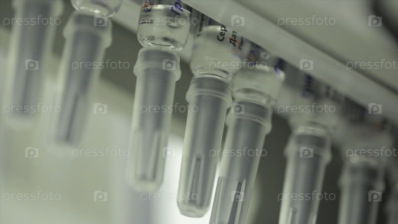 Фармацевтика.Фармацевтический работник управляет упаковочной машиной для таблеток. Производство шприцов. Шприц фармацевтическая промышленность. Линейный конвейер-машина для упаковки стеклянных бутылок ампул в коробках на фабрике