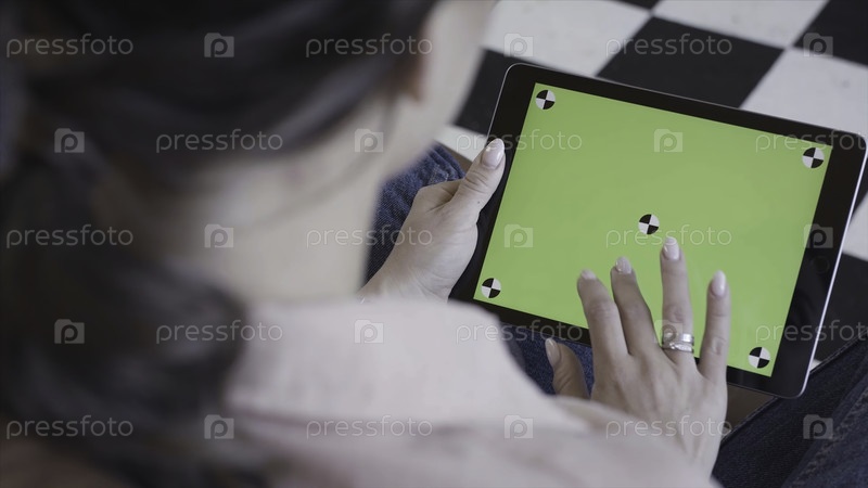 Молодая женщина использует черный планшет с зеленым экраном. резервные записи. Женщина держит планшет, увеличивая страницы, сидя на диване в гостиной. Ключ хрома