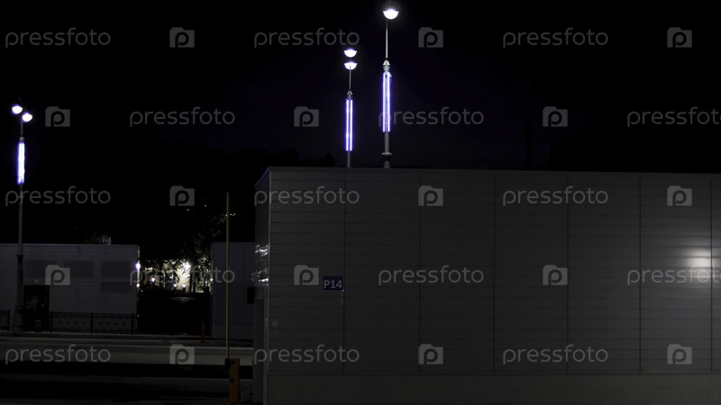 Боковый вид барьерного модуля автомойки на улице с неоновыми голубыми уличными фонарями ночью. резервные кадры. Автомобильная стирка поздно вечером на фоне черного неба