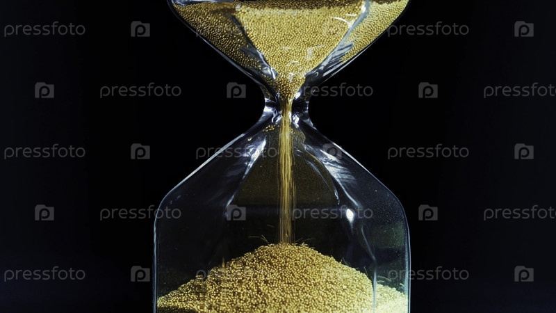Золотой песок внутри прозрачных песочников изолирован на черном фоне.Маленькие металлические частицы, проходящие через песочные часы измеряют время их прохождения