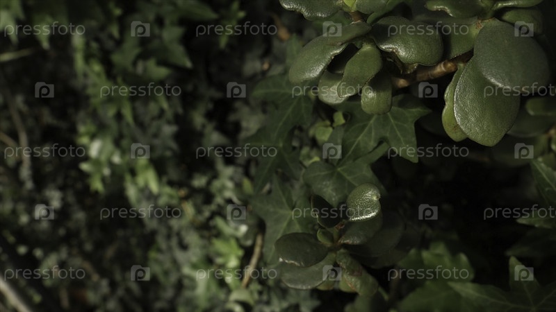 Вид сверху на листья фикуса, высокое дерево в темноте