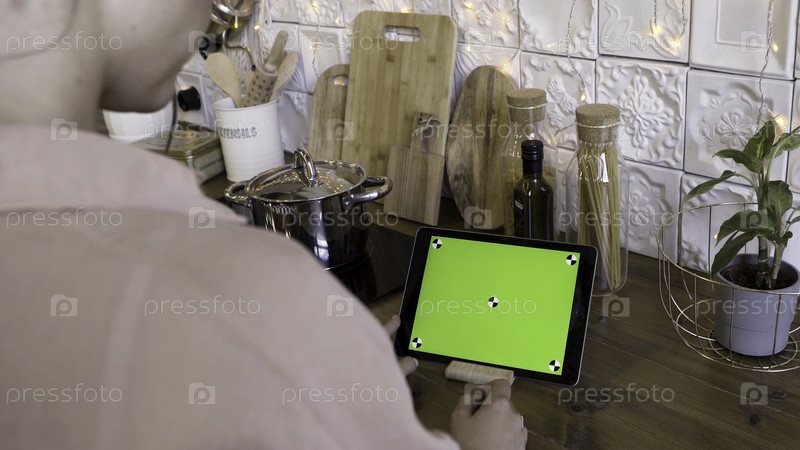 Задний вид женщины, нажимающей на планшет с зеленым экраном в кухне дома рецептур.Женщина использует свою хроматическую ключевую таблетку для приготовления пищи