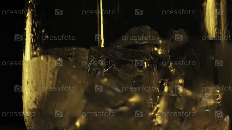 Процесс налива алкогольного напитка в стакан с выделенным льдом на темном фоне завершен. Резервные кадры. Концепция вечеринки, где виски, коньяк и шотландский виски заливаются в бокал со многими кубиками льда