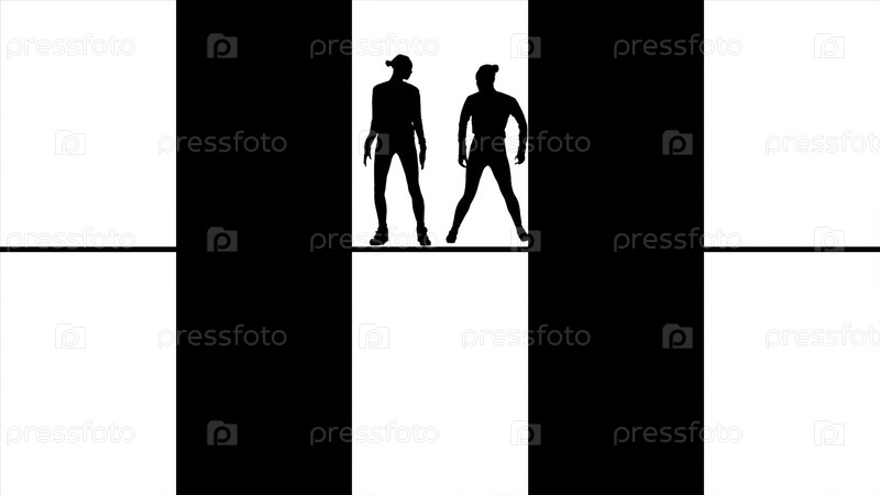 Абстрактные черные силуэты танцуют, прыгают и перемещаются в окнах, монохромны