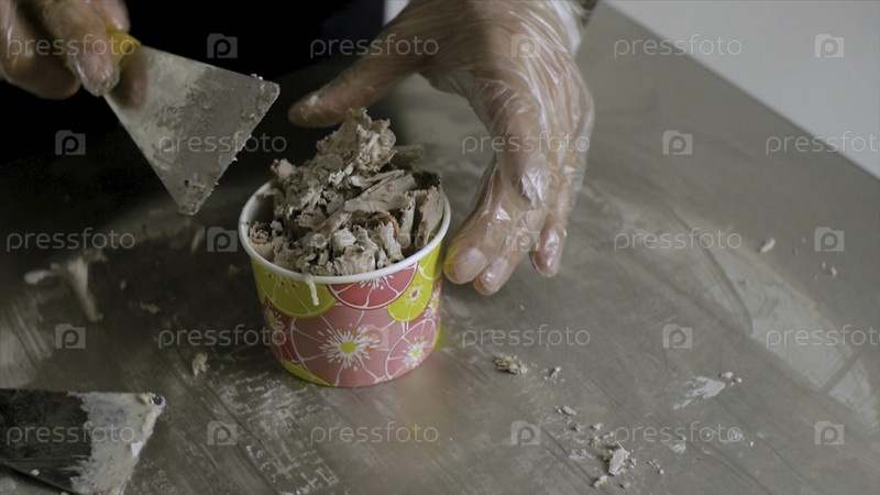 Процесс приготовления жареного мороженого. Клип. Таиландское жареное мороженое валяется в холодильнике. Органическое, натуральное мороженое, десерт ручной работы. Машина для гриля с охлажденной стальной кастрюлей. Приготовление тайского мороженого - Закро