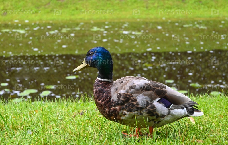 Утка с зеленой головой собирает пищу в траве возле пруда