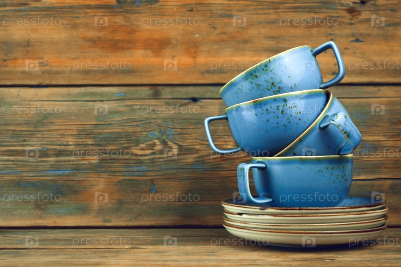 Куча голубых кружек в тарелках стоит на деревянном столе на сером фоне
