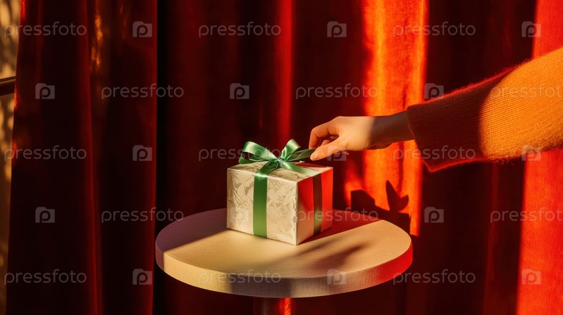 На круглом столе лежит упакованный подарок с зеленым луком, который отражает традицию дарения подарков, сезонное ожидание и элегантный стиль мероприятий