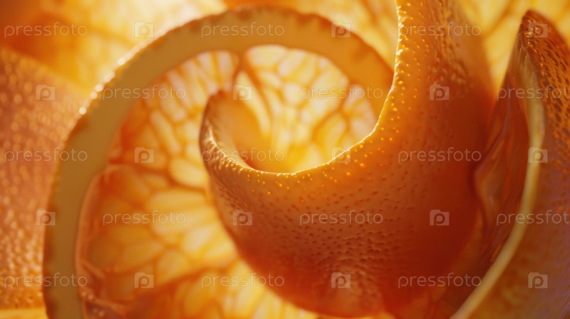 Свежая оранжевая кожура макроспирал раскрывает органические цитрусовые детали, идеально подходящие для фотографии продуктов питания, концепции пищи и натуральных ингредиентов