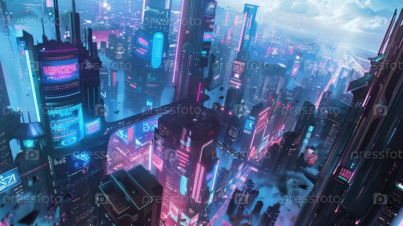 Неоновый горизонт мегаполиса возвышается над облаками, изображая архитектуру киберпанка и продвинутое городское будущее для произведений научной фантастики