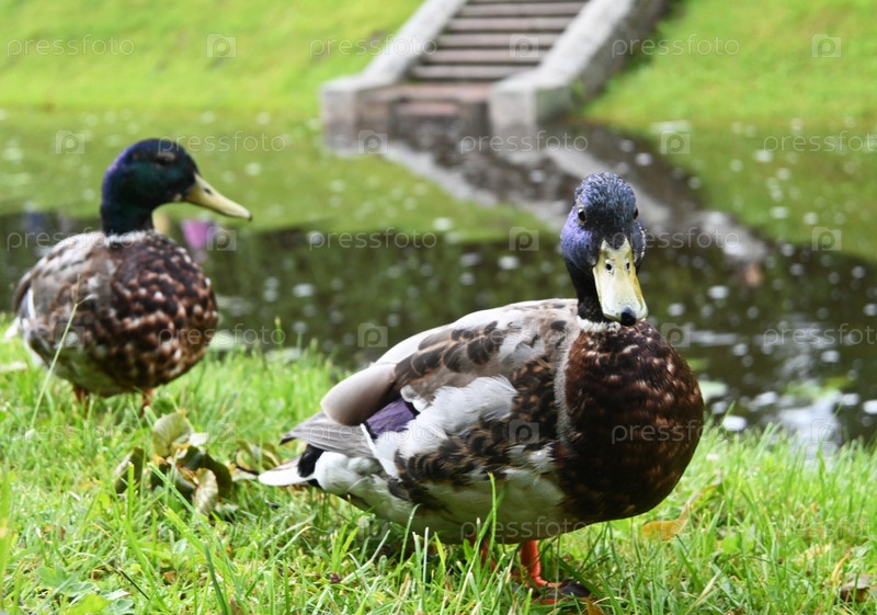 Утка с зеленой головой собирает пищу в траве возле пруда