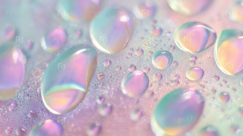 Иридесцентные капли воды мерцают на жемчужной поверхности, макро-абстрактная текстура с пастельными выделениями и светящимися отражениями для современных дизайнерских фонов