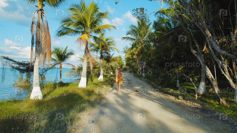 Женщина идет по грунтовой дороге с пальмами возле лагуны Бакалар в Мексике