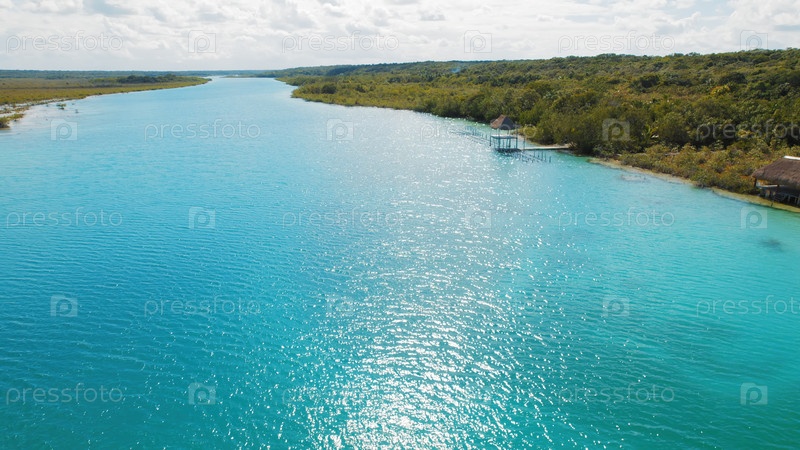 Широкий бирюзовый канал лагуны Бакалар с небольшими хижинами на берегу в Мексике