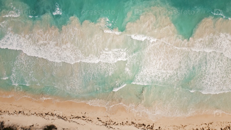 Вид сверху вниз морских волн, падающих на белый песчаный пляж с водорослями на берегу