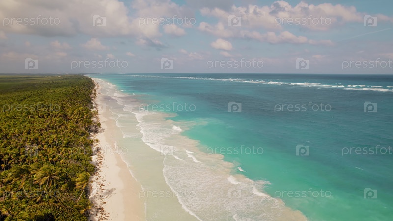 Вид на длинный тропический пляж с пальмами и чистым голубым океаном в Мексике