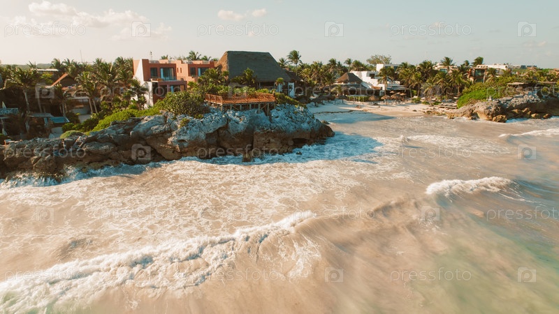 Женщина на деревянной палубе с видом на тропический курорт живописный пляжный город с видом на скалы и пальмы, обращенные к бирюзовому морю в Тулеме, Мексика