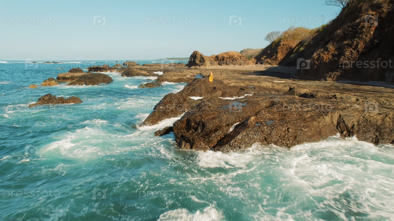Женщина идет вдоль скалистого побережья, окруженного бирюзовыми волнами океана в Коста-Рике