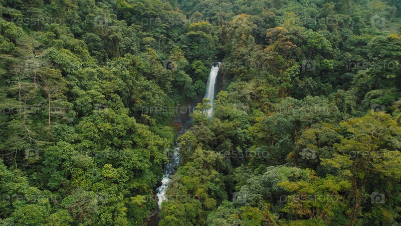 Водопад каскады через густой тропический лес, окруженный пышной зеленой растительностью